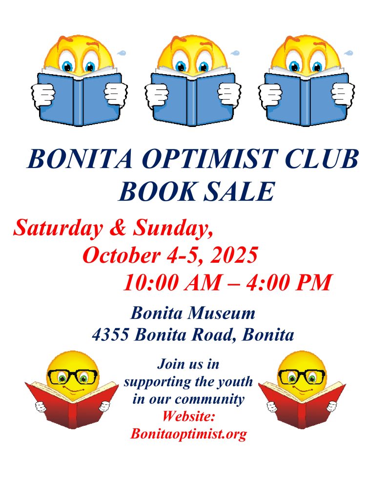 Stay connected and bookmark the dates. Click below to be added to our Book Sale reminders and all Bonita  Optimist  events.