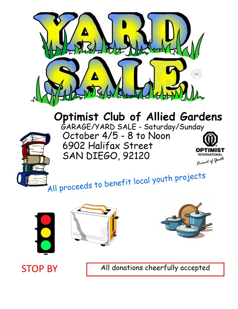 The Optimist Club of Allied Gardens invites you to their community Yard Sale on October 4–5, 2025, from 8 AM to 12 PM. Explore a wide variety of items, find hidden treasures at great prices, and know that your support helps fund youth programs in our community. Come shop, mingle, and make a difference!